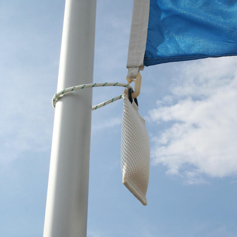 Das wasserdichte Nylonsäckchen ist mit Granulat gefüllt und wird mittels eines D-Ringes in den unteren Karabiner der Hissfahne eingehängt, der wiederum mit einer Mastschlaufe am Fahnenmast befestigt werden muss.