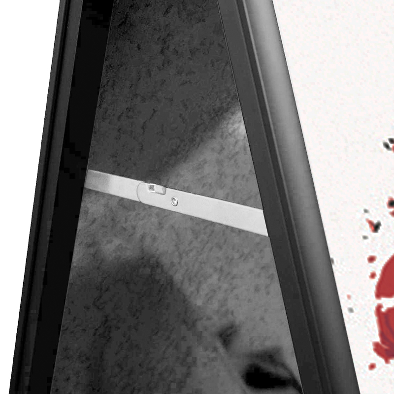 Der Rahmen hat ein 25mm breites Profil, die Ecken sind auf Gehrung. Inkl. PVC-Schutzabdeckung für die Plakate. Die Rückwand besteht aus einem verzinkten Stahlblech.