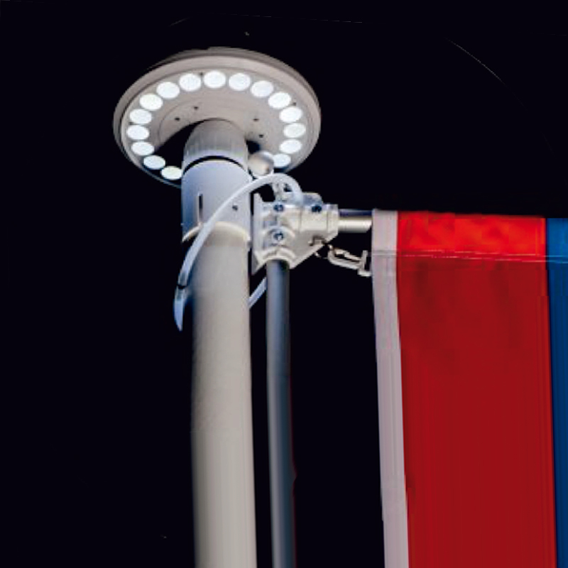Hochwertiger Aluminiummast mit innenliegender Seilführung und drehbarem Mastausleger "Windtracker". Die im Mast befindliche Hissvorrichtung ist durch eine Verschlussklappe vor dem Zugriff Unberechtigter geschützt..Geeignet für Auslegerfahnen im Hochformat.