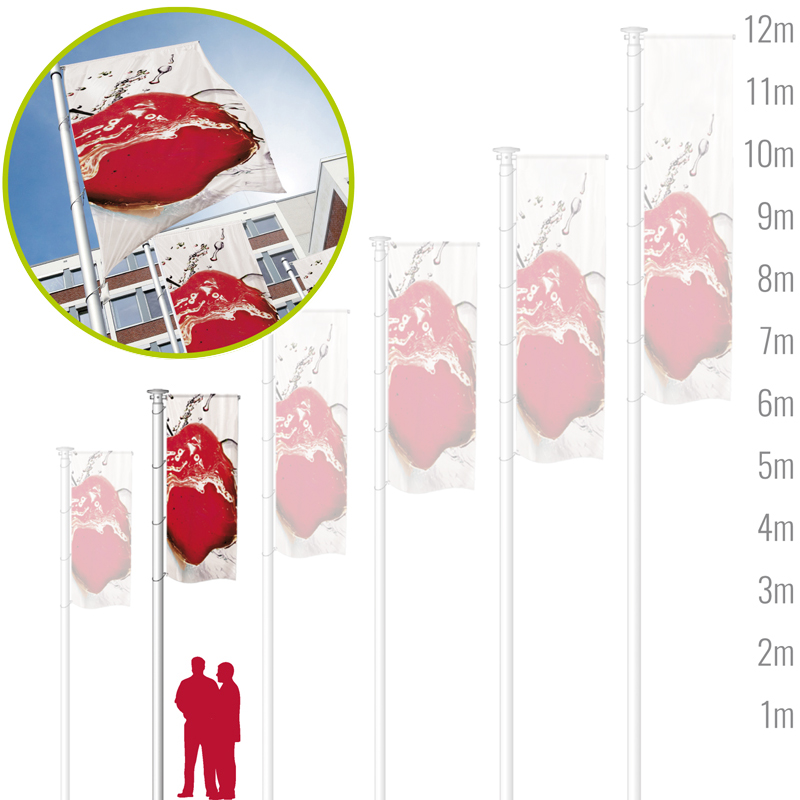 Die Werbefahne an einem Fahnenmast ist der ideale Werbeträger, den man schon von sehr weiter Entfernung wahrnimmt. Ideal vor dem Firmensitz, auf großen Parkplätzen von Einkaufszentren, Großmärkten oder auf Großveranstaltungen an einem mobilen oder fest installierten Fahnenmast.Der Fahnentyp "Ausleger" ist für Masten mit einem Mastausleger. Dieser Fahnentyp wirbt auch dann, wenn mal kein Wind weht.