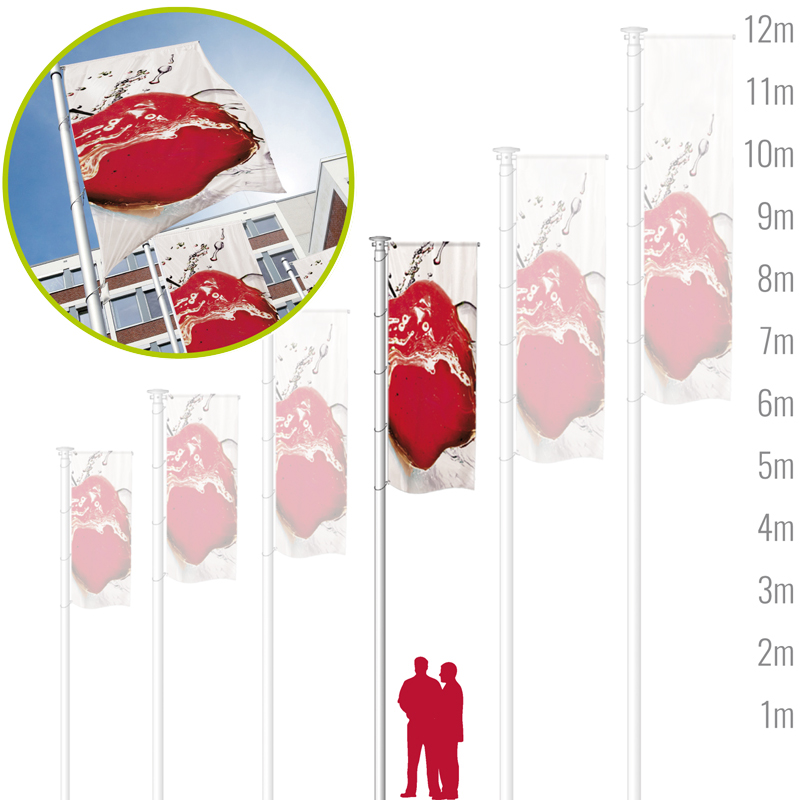 Die Werbefahne an einem Fahnenmast ist der ideale Werbeträger, den man schon von sehr weiter Entfernung wahrnimmt. Ideal vor dem Firmensitz, auf großen Parkplätzen von Einkaufszentren, Großmärkten oder auf Großveranstaltungen an einem mobilen oder fest installierten Fahnenmast.Der Fahnentyp "Ausleger" ist für Masten mit einem Mastausleger. Dieser Fahnentyp wirbt auch dann, wenn mal kein Wind weht.
