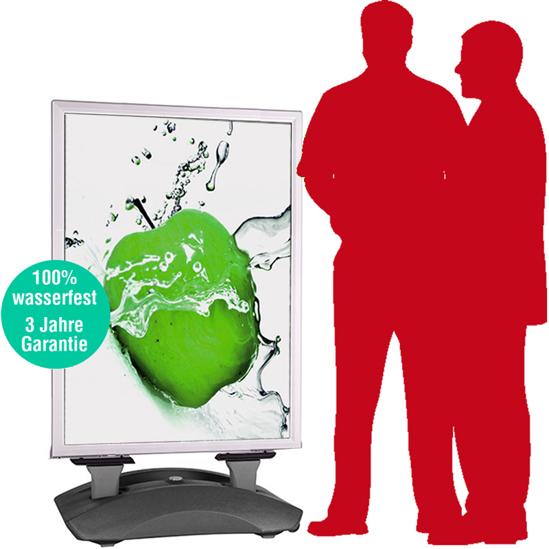 Dieser hochwertige, wind- und wetterfester Plakataufsteller ist ideal für den Außeneinsatz. Ein wasserbefüllbarer Kunststofffuß mit Rollen und spezielle Federbeine sorgen dafür, dass der Plakataufsteller auch stärksten Winden trotzt. Silikondichtungen verhindern das Eindringen von Regenwasser in den Plakatrahmen. Das Auswechseln der Plakate ist aufgrund des patentierten Klapprahmens sehr einfach.- Beidseitige Ausführung