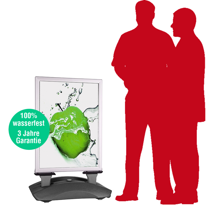Dieser hochwertige, wind- und wetterfester Plakataufsteller ist ideal für den Außeneinsatz. Ein wasserbefüllbarer Kunststofffuß mit Rollen und spezielle Federbeine sorgen dafür, dass der Plakataufsteller auch stärksten Winden trotzt. Silikondichtungen verhindern das Eindringen von Regenwasser in den Plakatrahmen. Das Auswechseln der Plakate ist aufgrund des patentierten Klapprahmens sehr einfach.- Beidseitige Ausführung
