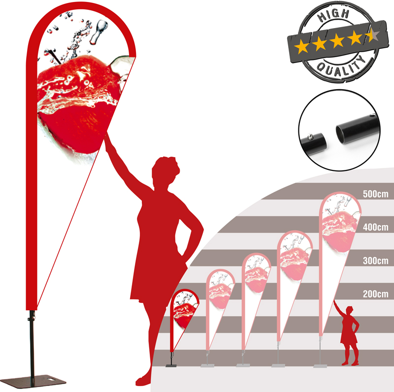 Die Beachflags sind in- und outdoor einsetzbar. Bei sehr starkem und böigen Wind sollten die Beachflags eingeholt werden (ab Windstärke 6/7). Ideal für Outdoor-Events, vor dem Ladengeschäft sowie bei langfristigen Einsätzen.
