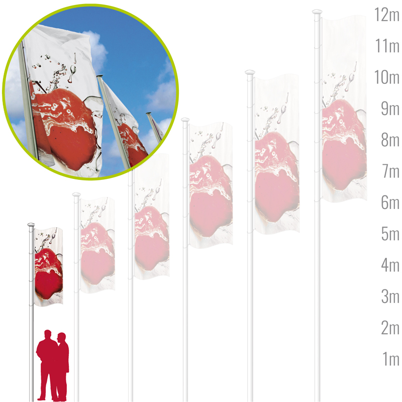 Die Werbefahne an einem Fahnenmast ist der ideale Werbeträger, den man schon von sehr weiter Entfernung wahrnimmt. Ideal vor dem Firmensitz, auf großen Parkplätzen von Einkaufszentren, Großmärkten oder auf Großveranstaltungen an einem mobilen oder fest installierten Fahnenmast.Der Fahnentyp "Hissfahne" ist sowohl für Fahnenmasten mit innenliegender als auch mit außenliegender Leinenführung geeignet.