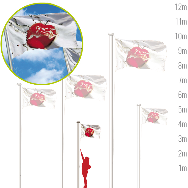 Die Werbefahne an einem Fahnenmast ist der ideale Werbeträger, die man schon von sehr weiter Entfernung wahrnimmt. Ideal vor dem Firmensitz, auf großen Parkplätzen von Einkaufszentren, Großmärkten oder auf Großveranstaltungen. Montiert und gehisst an einem mobilen oder fest installierten Fahnenmast. Der Klassiker ist die Fahne im Querformat.Häufig versehen mit einem Logo oder der Landesfahne. Eingesetzt an einem Fahnenmast, aber oft auch an einer mobilen Maststange, z.B. bei Fußballspielen im Fanblock. Die Fahne im Hochformat ist jedoch die idealere Werbefahne für Fahnenmasten, aufgrund der viel größeren Werbefläche.Der Fahnentyp "HISSFAHNE querformat" wird vorrangig an Fahnenmasten mit außenliegender Leinenführung montiert. Aber auch für innenliegende/verdeckter Leinenführung ist der Fahnentyp geeignet. Dabei wird entweder die Fahne oben und unten zwischen das Hissseil montiert (Konfektion 2 oder 3) oder an zwei Schlaufen, die in das Hissseil ober- und unterhalb der Fahne geknotet werden (Konfektion 3).