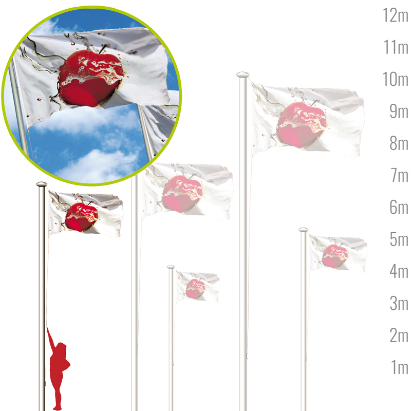 Die Werbefahne an einem Fahnenmast ist der ideale Werbeträger, die man schon von sehr weiter Entfernung wahrnimmt. Ideal vor dem Firmensitz, auf großen Parkplätzen von Einkaufszentren, Großmärkten oder auf Großveranstaltungen. Montiert und gehisst an einem mobilen oder fest installierten Fahnenmast. Der Klassiker ist die Fahne im Querformat.Häufig versehen mit einem Logo oder der Landesfahne. Eingesetzt an einem Fahnenmast, aber oft auch an einer mobilen Maststange, z.B. bei Fußballspielen im Fanblock. Die Fahne im Hochformat ist jedoch die idealere Werbefahne für Fahnenmasten, aufgrund der viel größeren Werbefläche.Der Fahnentyp "HISSFAHNE querformat" wird vorrangig an Fahnenmasten mit außenliegender Leinenführung montiert. Aber auch für innenliegende/verdeckter Leinenführung ist der Fahnentyp geeignet. Dabei wird entweder die Fahne oben und unten zwischen das Hissseil montiert (Konfektion 2 oder 3) oder an zwei Schlaufen, die in das Hissseil ober- und unterhalb der Fahne geknotet werden (Konfektion 3).