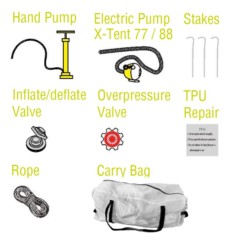 - 1x Inflatable Standbeinset, im Dachfirst fest vernäht, TPU-Luftschlauch mit Polyesterhülle aus 250D Dacron-Polyester, wasserfest, B1 Brandschutz