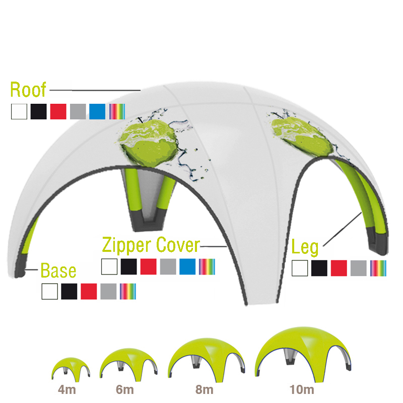 Die Zeltfarben (4-5 Farben sowie vollflächiger Farbdruck) für Dach, Standbeine, Reißverschlussabdeckungen, Sockel und Zeltwände sind frei wählbar. Und somit ist das INFLAT X-TENT EVENT Aufblaszelt ideal als aufblasbares Werbe- und Eventzelt.