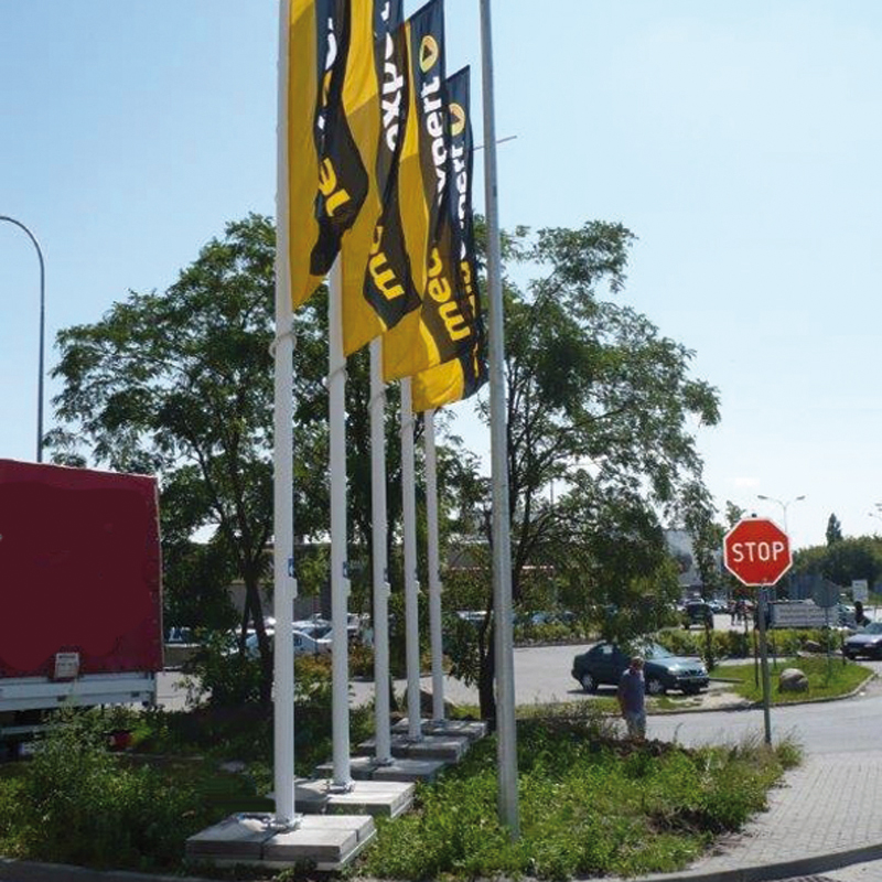 Der Fahnenmastständer kann mit bis zu 8 Betonplatten im Format 50x50x7cm bestückt werden, die je ca. 35kg wiegen. Die Betonplatten werden normalerweise vom Besteller vor Ort beschafft. Auf Anfrage können wir diese aber auch liefern.