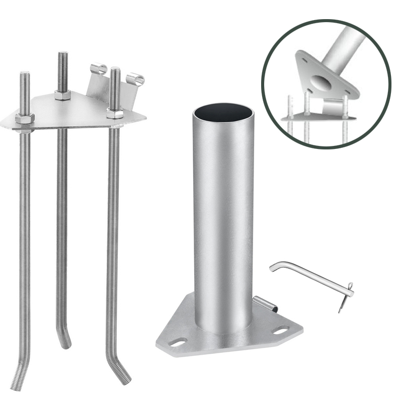 Das Ergänzungs-Set besteht aus einem Bodenanker, einem Kippgelenk mit aufgesetzter Hülse inkl. Dreiecksfuß, über die der Fahnenmast gestülpt wird.