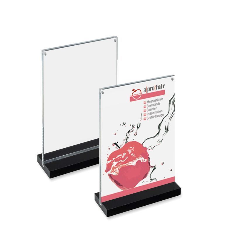 Der doppelseitige Acrylständer ist ideal zum Aufstellen auf einem Tisch/einer Theke in verschiedenen öffentlichen Räumen, z.B. Restaurants, Banken, Hotels sowie am Messe- und Infostand usw. Mit formschönem Fuß aus schwarzem, durchgefärbten Acrylglas.