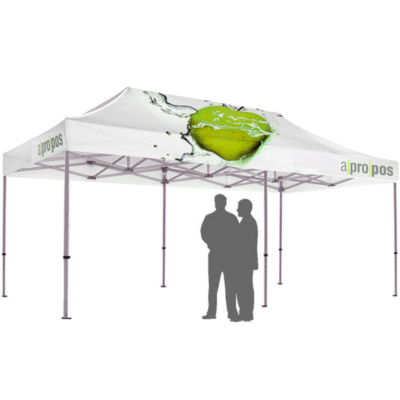 - wahlweise bedrucktes Zeltdach, umweltfreundlicher Sublimationsdruck, Polyester 235g/qm, optional mit B1-Ausrüstung (flammenhemmend), wasserfest beschichtet