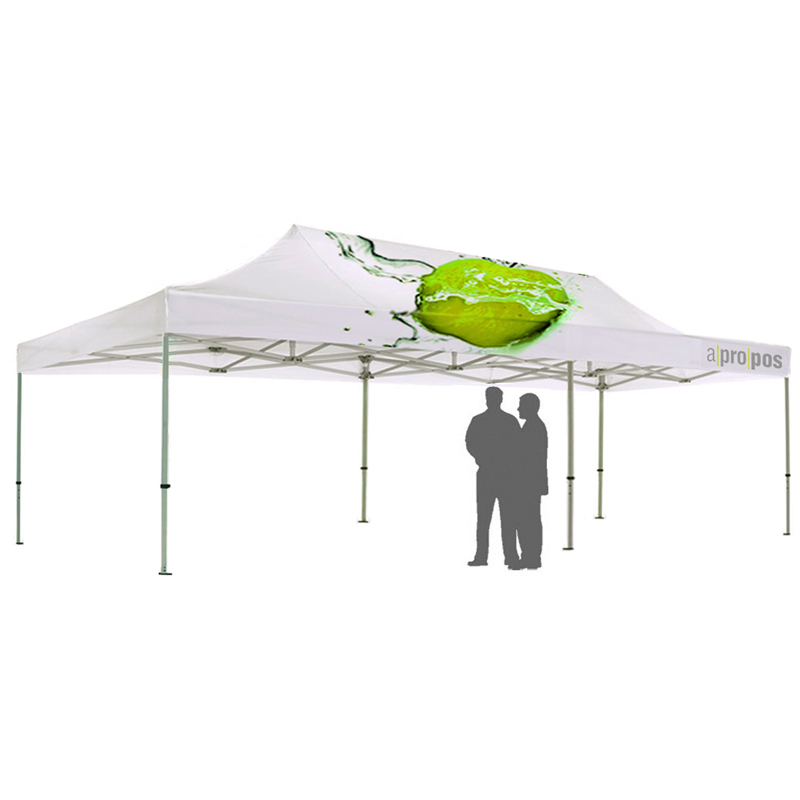 - wahlweise bedrucktes Zeltdach, umweltfreundlicher Sublimationsdruck, Polyester 235g/qm, optional mit B1-Ausrüstung (flammenhemmend), wasserfest beschichtet