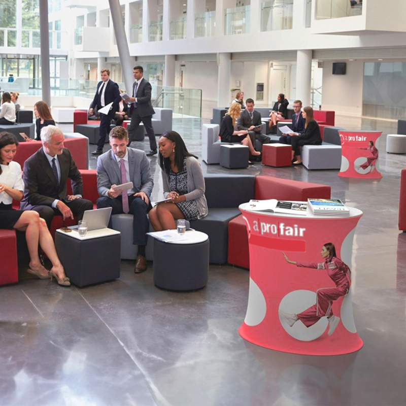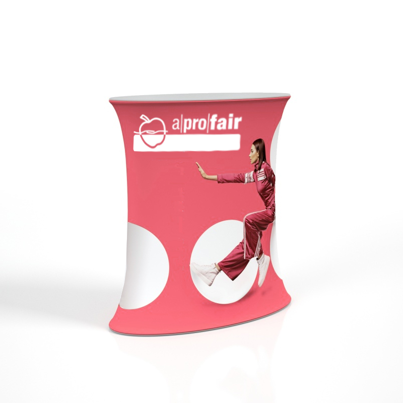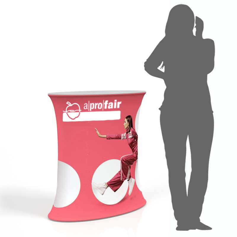 Der TexCounter OVAL eignet sich im Büro, an der Rezeption oder im Chillout-Bereich als Tisch oder auch als Werbetheke auf Messen und Ausstellungen. Die Textilgrafik ist jederzeit schnell zu wechseln und die Werbebotschaft kann jederzeit angepasst werden.