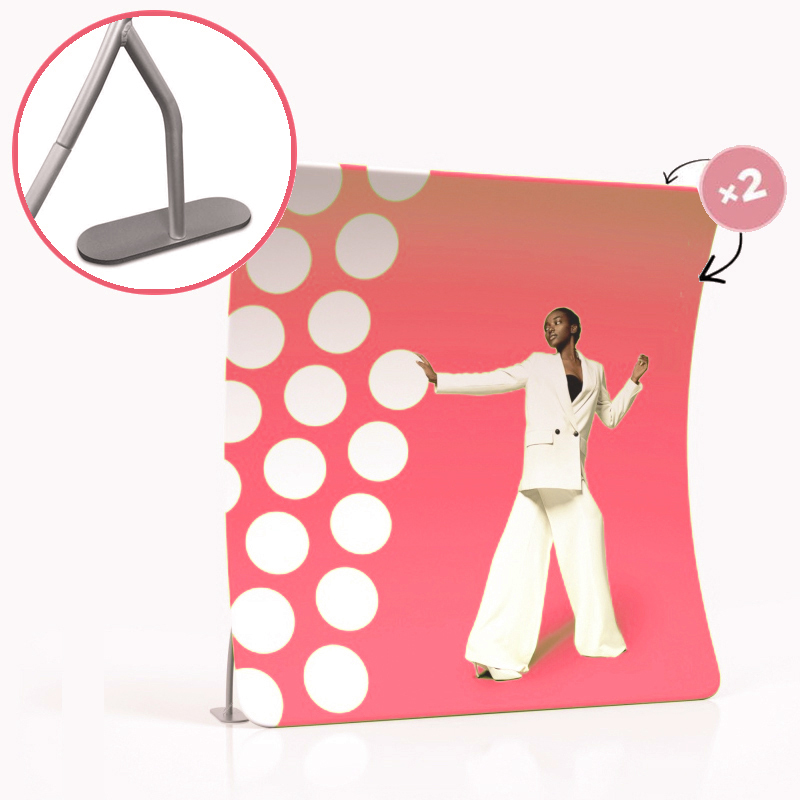 Die c-förmig gebogene TubeFrame Textilwand besteht aus einem Aluminiumrahmen aus Rundrohren und einem Textilüberzug.