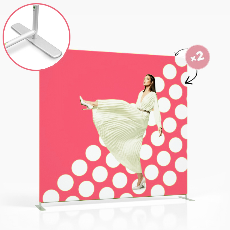 Die gerade TubeFrame Textilwand besteht aus einem Aluminiumrahmen aus Rundrohren und einem Textilüberzug.