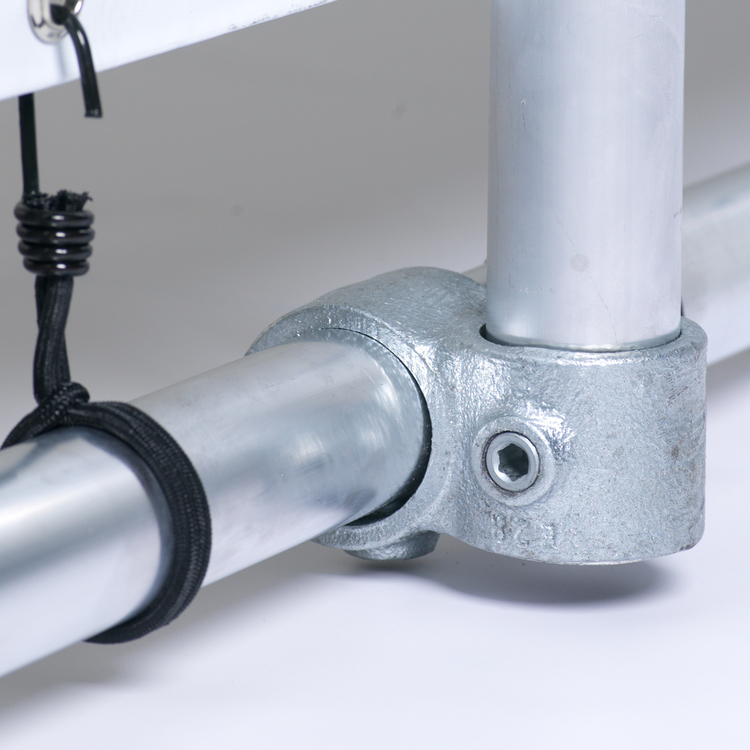 Einfach zu montierender TUBULAR Standrahmen BASE bestehend aus Rohrverbindern, T-Füßen und Aluminiumstangen. Der Rahmen steht auf T-Füßen direkt auf dem Boden (Base) und hat ein Querformat.Lieferung erfolgt inkl. Werbebanner