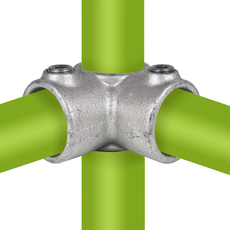 Eckverbindung 90° zur Verwendung als mittlere Abzweigung sowie als Eckverzweigung, z.B als Ecke mit drei Rohrabgängen. Ein Rohr passt durch den Verbinder. Zwei weitere Rohre werden im 90°-Winkel montiert.